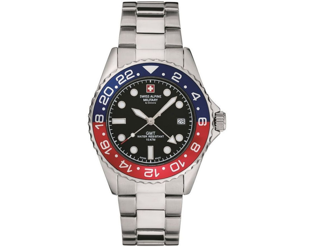 Kvarcas Vyras Rankinis laikrodis Swiss Alpine Military 7052.1131 su Nerūdijantis plienas dėklu, 42 mm skersmens, Mineralinis stiklas, Juoda ciferblatu ir Sidabras Nerūdijantis plienas apyranke.