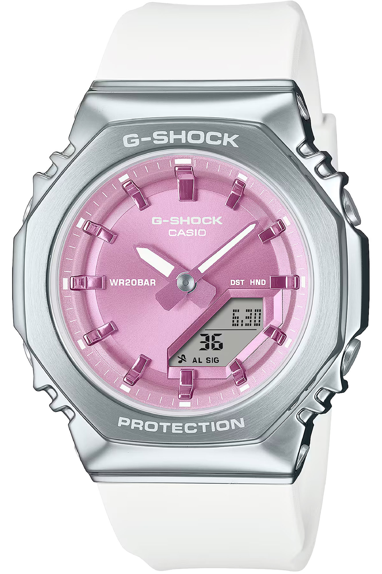 Kvarcs Cilvēks Rokas pulkstenis Casio G-Shock GM-S2110-7A6ER ar Sveķi korpusu, ar diametru 40 mm, Minerāls stikls, Roze ciparnīcu un Balts Silikona siksnu.