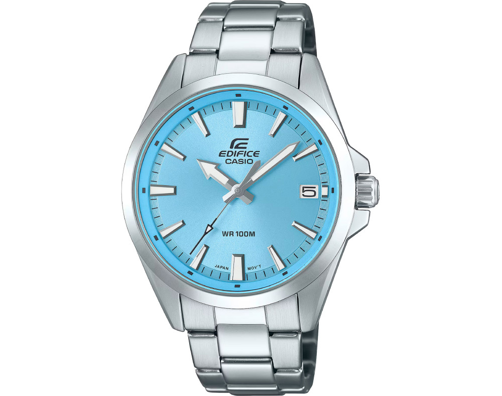 Kvarcs Cilvēks Rokas pulkstenis Casio Edifice EFV-100D-2BVUEF ar Nerūsējošais tērauds korpusu, ar diametru 42 mm, Minerāls stikls, Tirkīzs ciparnīcu un Sudrabs Nerūsējošais tērauds siksnu.