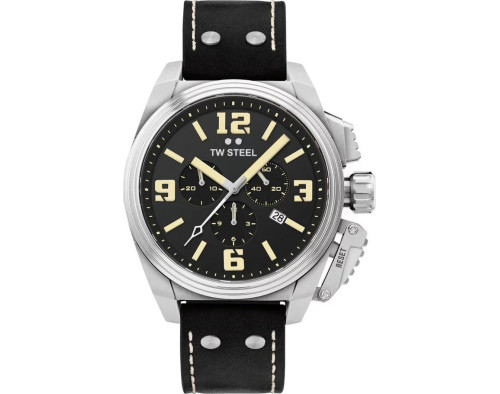 Kvarcs Cilvēks Rokas pulkstenis TW Steel TW1011 ar Nerūsējošais tērauds korpusu, ar diametru 46 mm, Minerāls ar safīru apstrādi stikls, Melns ciparnīcu un Melns Āda siksnu.