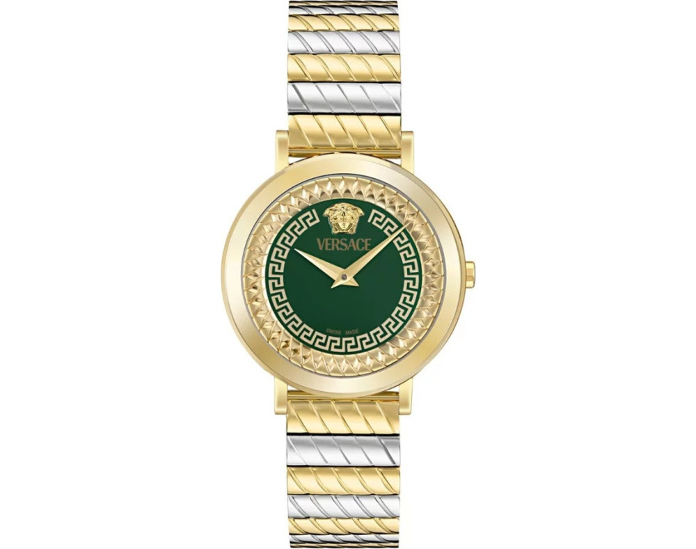 Kvarcs Sieviete Rokas pulkstenis Versace VE0O00225 ar Nerūsējošais tērauds korpusu, ar diametru 35 mm, Minerāls ar safīru apstrādi stikls, Zaļš ciparnīcu un Divu toņu Nerūsējošais tērauds siksnu.