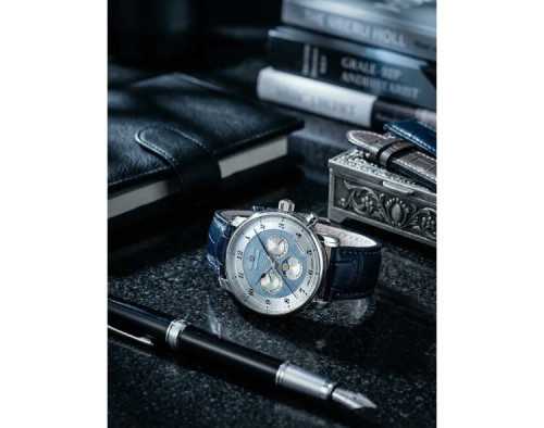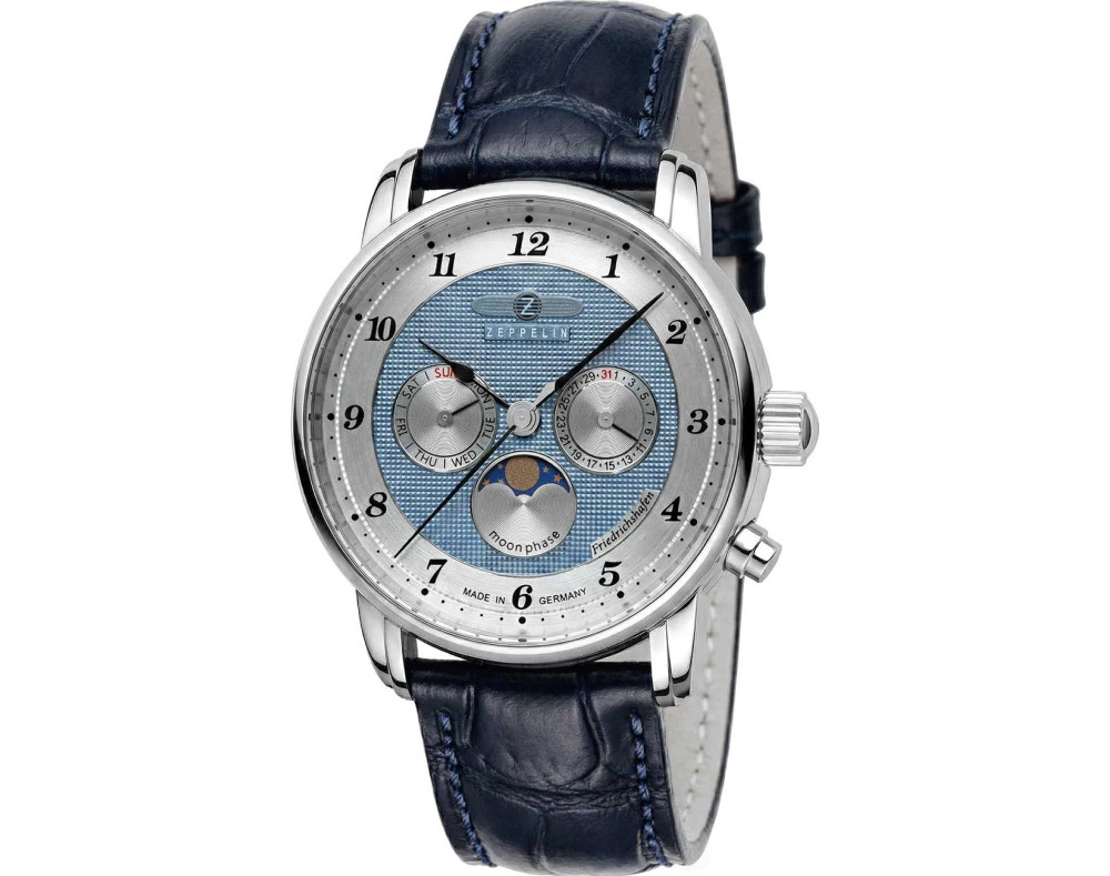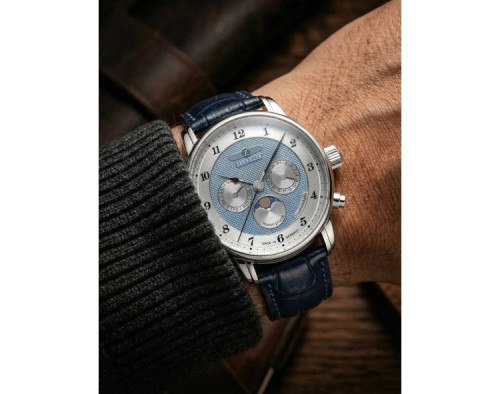 Kvarcs Cilvēks Rokas pulkstenis Zeppelin 8536-3 ar Nerūsējošais tērauds korpusu, ar diametru 40 mm, Minerāls K1 stikls, Debesu zils ciparnīcu un Zils Āda siksnu.