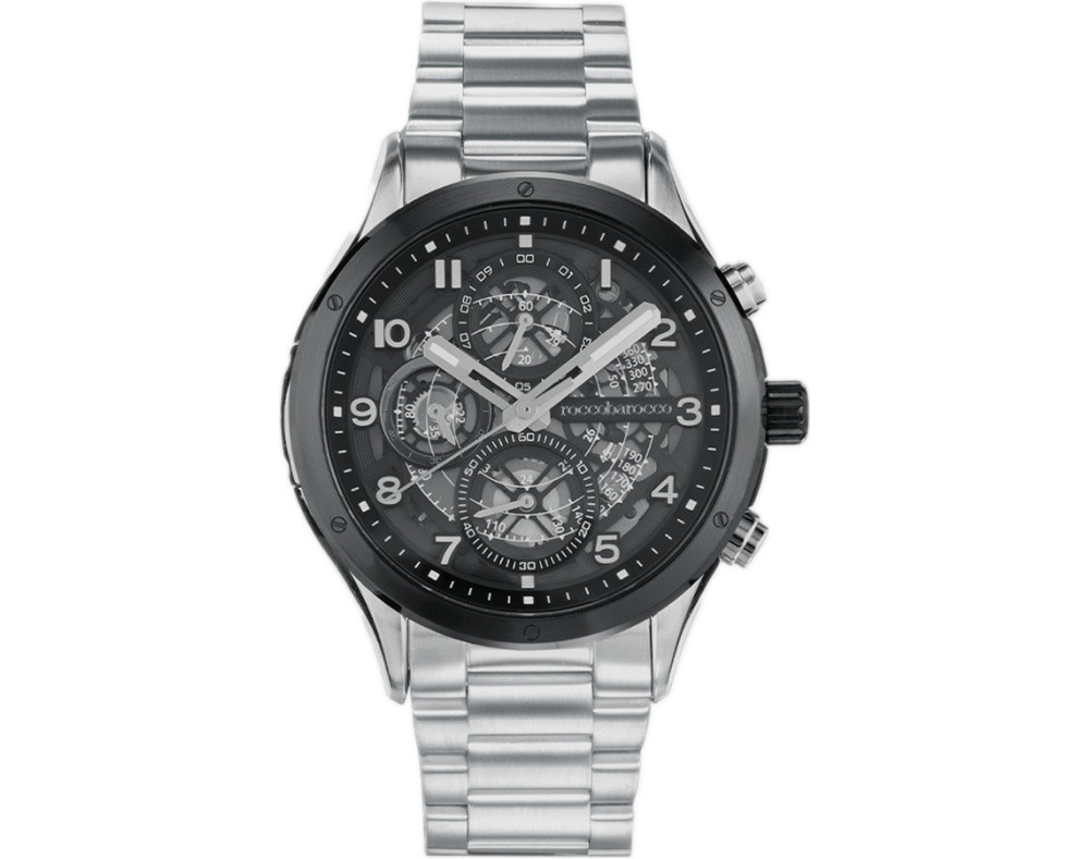 Kvarcs Cilvēks Rokas pulkstenis Roccobarocco RB.5327M-03M ar Nerūsējošais tērauds korpusu, ar diametru 46 mm, Minerāls stikls, Melns ciparnīcu un Sudrabs Nerūsējošais tērauds siksnu.