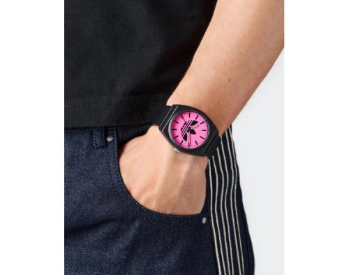 Кварц унисекс Наручные часы Adidas AOST25548, корпус Пластик, диаметр 38 mm, Акрил стекло, Роза циферблат и Черный Смола ремешок.