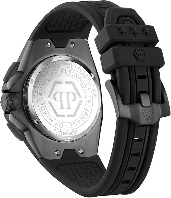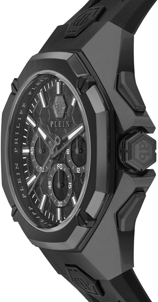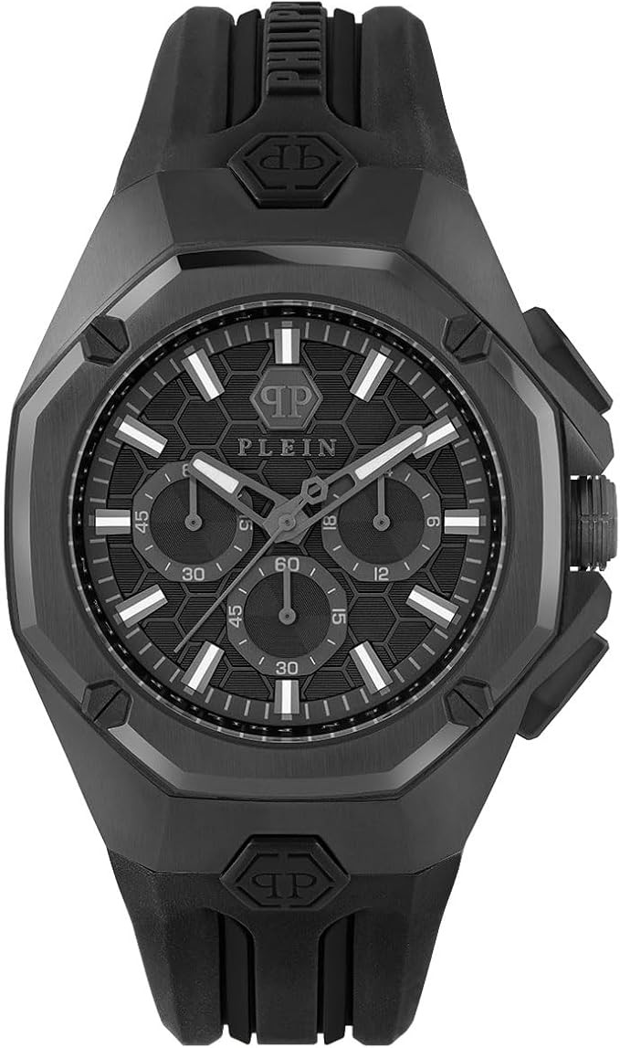 Armbanduhr Philipp Plein Octagon Hyper PWTBA0623 für Herren mit Quarzwerk, Uhrengehäuse aus Edelstahl mit einem Durchmesser von 45 mm, Ziffernblatt Schwarz und Uhrenarmband aus Silikon in der Farbe Schwarz.