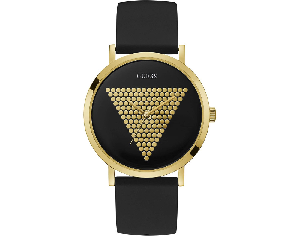 Armbanduhr Guess Imprint W1161G1 für Herren mit Quarzwerk, Uhrengehäuse aus Edelstahl mit einem Durchmesser von 44 mm, Ziffernblatt Schwarz und Uhrenarmband aus Silikon in der Farbe Schwarz.