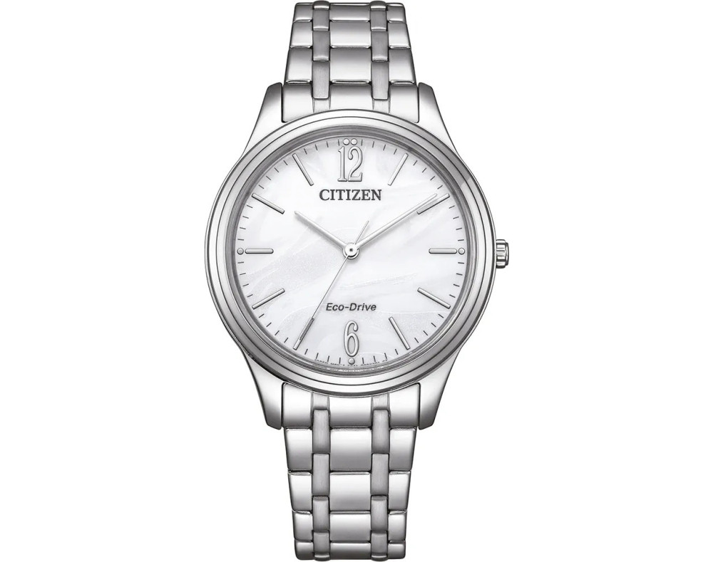 Armbanduhr Citizen Eco-Drive EM0411-71A für Damen mit Quarzwerk, Uhrengehäuse aus Edelstahl mit einem Durchmesser von 34 mm, Ziffernblatt Perlmutt und Uhrenarmband aus Edelstahl in der Farbe Silber.