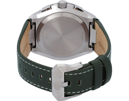 Armbanduhr Citizen Radio Controlled JY8147-01X für Herren mit Quarzwerk, Uhrengehäuse aus Edelstahl mit einem Durchmesser von 46 mm, Ziffernblatt Grün und Uhrenarmband aus Leder in der Farbe Grün.