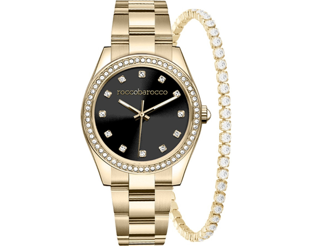 Reloj de pulsera Roccobarocco RB.2579L-07M para Mujer con movimento de Cuarzo, con caja de Acero inoxidable con diàmetro de 32 mm, con cuadrante Negro y correa en Acero inoxidable, color Dorado.