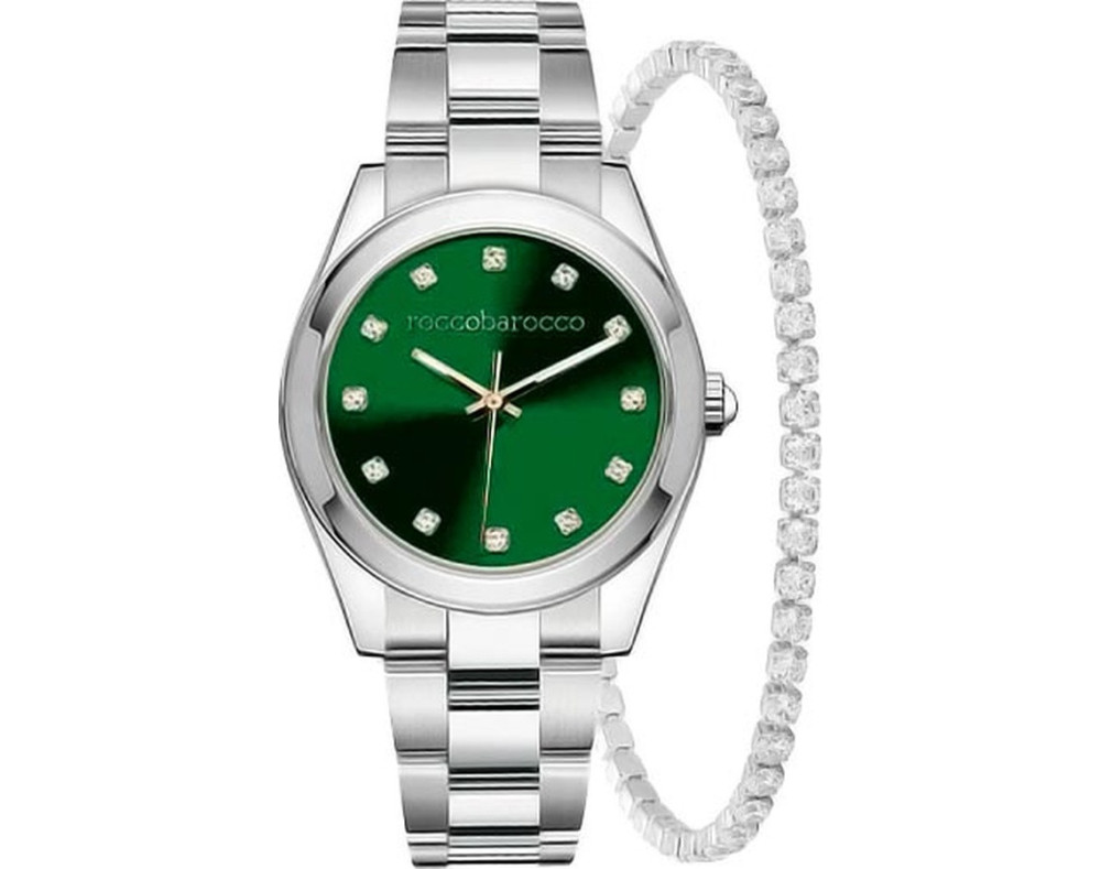 Reloj de pulsera Roccobarocco RB.2579L-13M para Mujer con movimento de Cuarzo, con caja de Acero inoxidable con diàmetro de 32 mm, con cuadrante Verde y correa en Acero inoxidable, color Plateado.