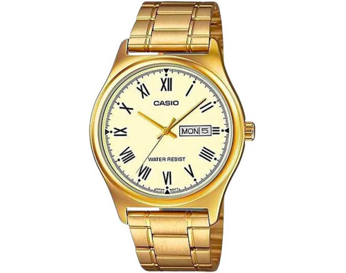 Kvarts Mees Käekell Casio MTP-V006G-9B, Messing korpusega, läbimõõduga 38 mm, Mineraal klaasist, Kuldne sihverplaadi ja Kuldne Roostevaba teras rihm.