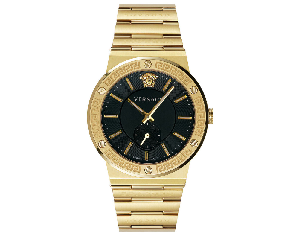 Kvarts Mees Käekell Versace VEVI00821, Roostevaba teras korpusega, läbimõõduga 41 mm, Safiiri töötlusega mineraal klaasist, Must sihverplaadi ja Kuldne Roostevaba teras rihm.