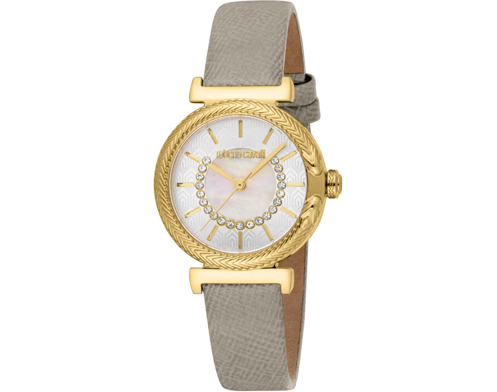 Kvarts Naine Käekell Roberto Cavalli RC5L137L0025, Roostevaba teras korpusega, läbimõõduga 30 mm, Mineraal klaasist, Pärlmutter sihverplaadi ja Hall Nahk rihm.