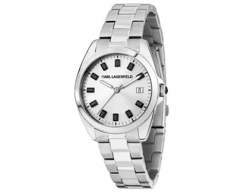 Montre bracelet Karl Lagerfeld Round Essentials R0553101514 pour Femme à Quartz, avec une boîtier de Acier inoxydable d’un diamètre de 35 mm, avec un cadran Argent et avec un bracelet de Acier inoxydable en couleur Argent.