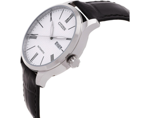 Montre bracelet Citizen NH8350-08A pour Homme à Mécanique, avec une boîtier de Acier inoxydable d’un diamètre de 40 mm, avec un cadran Blanc et avec un bracelet de Cuir en couleur Noir.