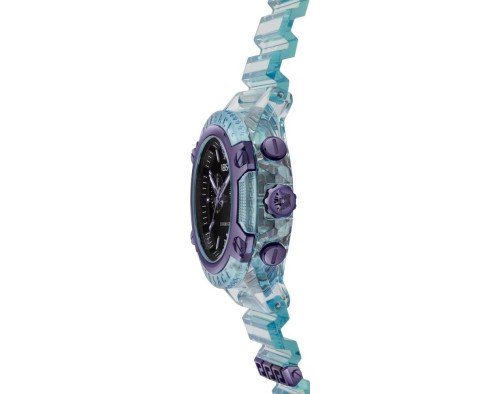 Quartz Man Wristwatch Versace New Icon VE8P01225 with Plastic case, with diameter 44 mm, Black dial and Light blue Plastic band.