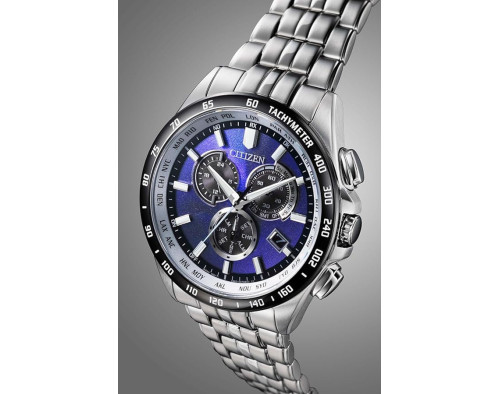 Quartz Man Wristwatch Citizen Radio Controlled CB5874-81L with Stainless steel case, with diameter 43 mm, Blue dial and Silver Stainless steel band.