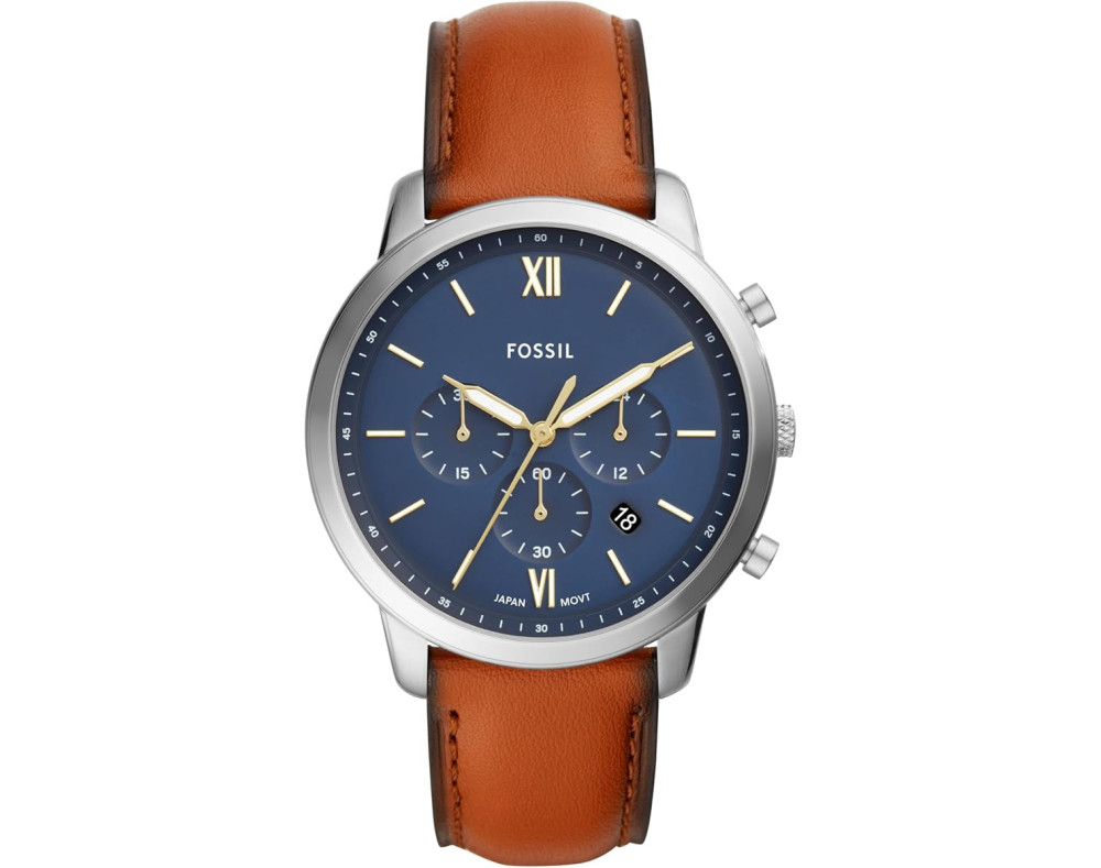 Orologio da polso Fossil Neutra FS5453 Cronografo Uomo con movimento Al quarzo, cassa in Acciaio inossidabile di diametro 44 mm, quadrante Blu, vetro Minerale e cinturino in Pelle di colore Marrone.