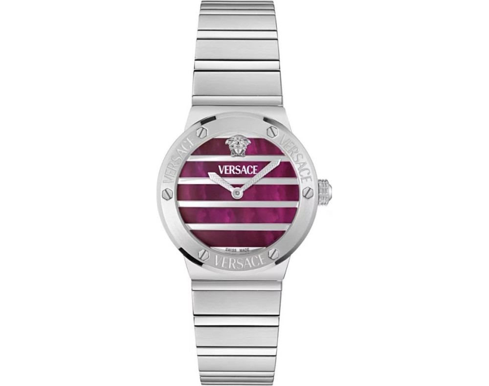 Orologio da polso Versace Greca Logo Pearl VE0S00125 Analogico Donna con movimento Al quarzo, cassa in Acciaio inossidabile di diametro 33 mm, quadrante Viola, vetro Minerale con trattamento Zaffiro e cinturino in Acciaio inossidabile di colore Argento.