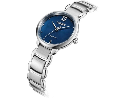 Orologio da polso Citizen Eco-Drive Elegance EM0920-86L Analogico Donna con movimento Al quarzo, cassa in Acciaio inossidabile di diametro 28 mm, quadrante Blu, vetro Minerale con trattamento Zaffiro e cinturino in Acciaio inossidabile di colore Argento.