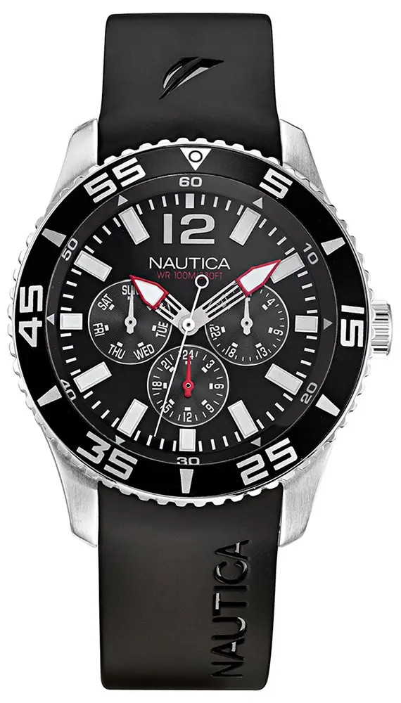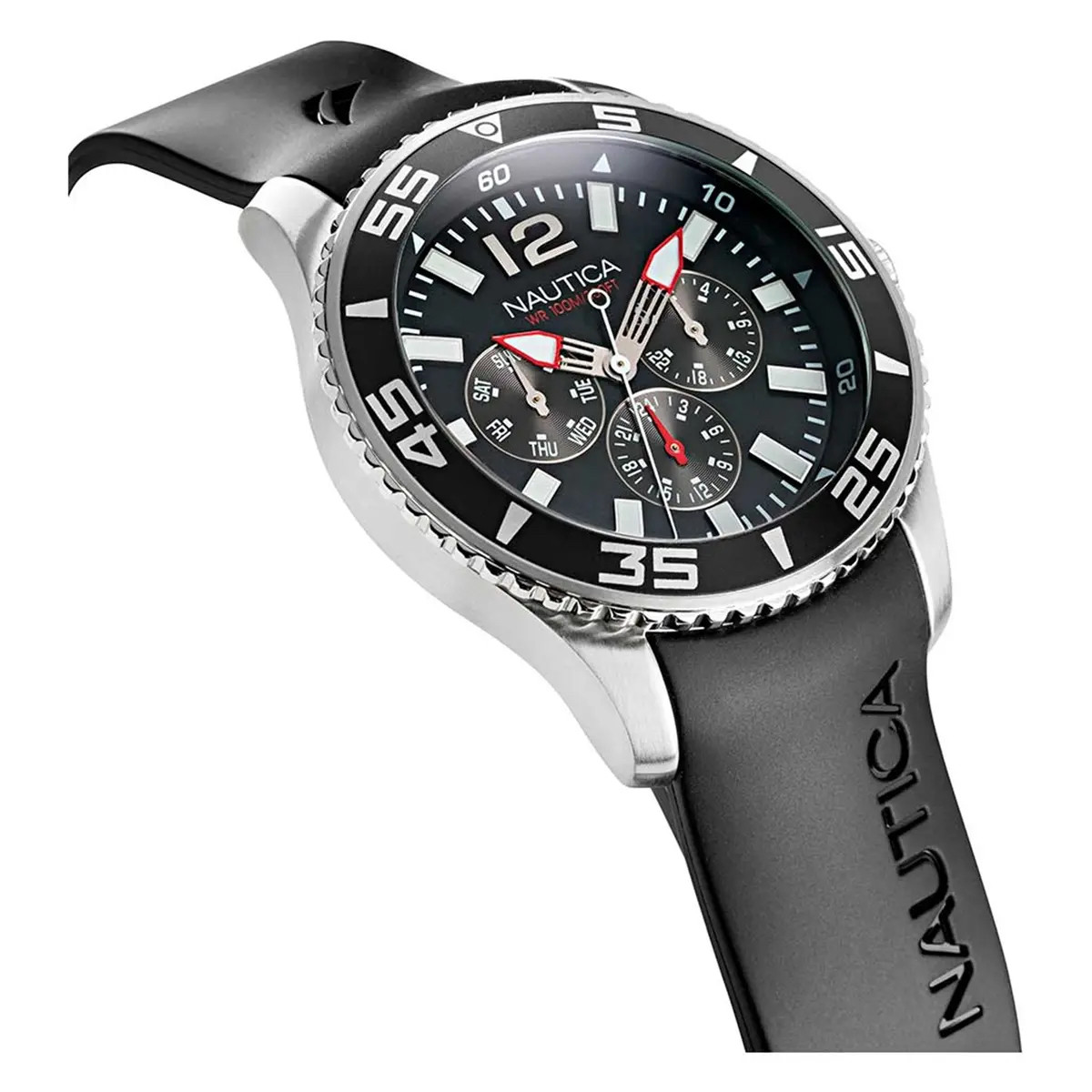 Kvarcas Vyras Rankinis laikrodis Nautica NAPLECR11 su Nerūdijantis plienas dėklu, 44 mm skersmens, Mineralinis stiklas, Juoda ciferblatu ir Juoda Silikonas apyranke.