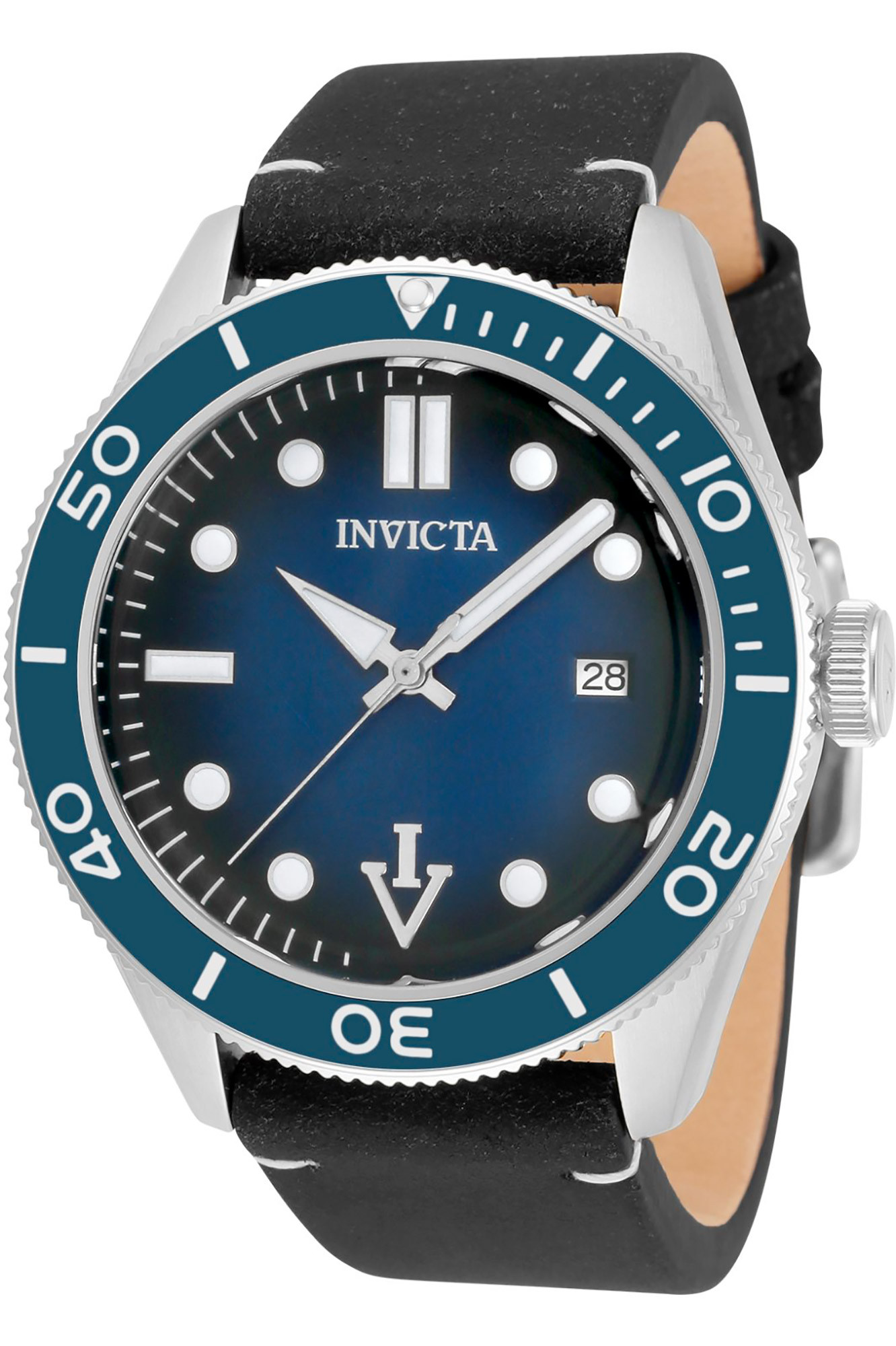 Kvarcas Vyras Rankinis laikrodis Invicta 33515 su Nerūdijantis plienas dėklu, 45 mm skersmens, Mineralinis stiklas, Mėlyna ciferblatu ir Juoda Oda apyranke.