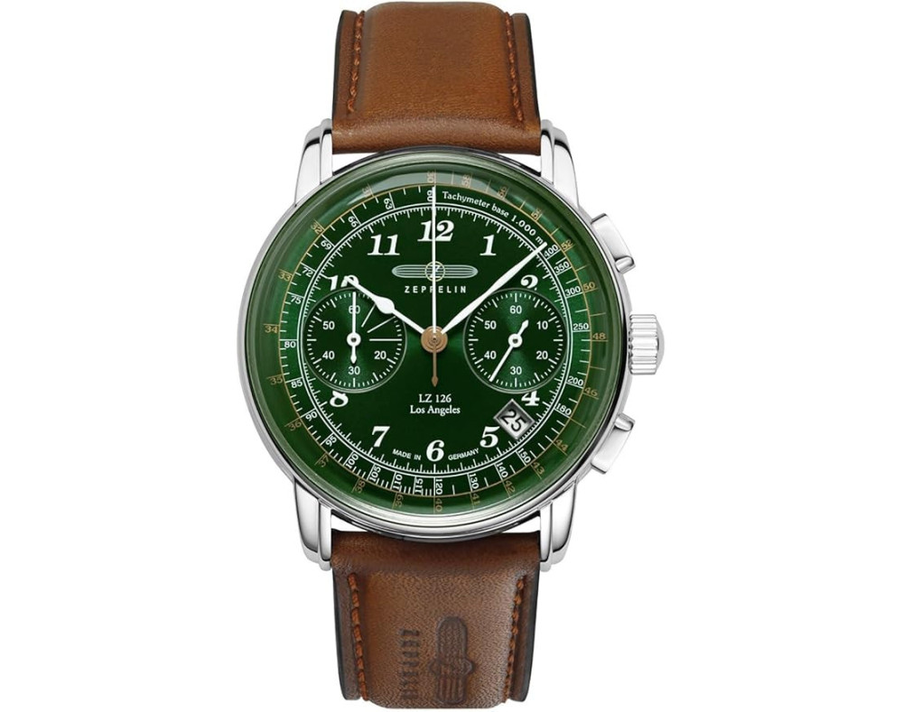 Kvarcas Vyras Rankinis laikrodis Zeppelin 7614-4 su Nerūdijantis plienas dėklu, 42 mm skersmens, Mineralinis K1 stiklas, Žalias ciferblatu ir Ruda Oda apyranke.