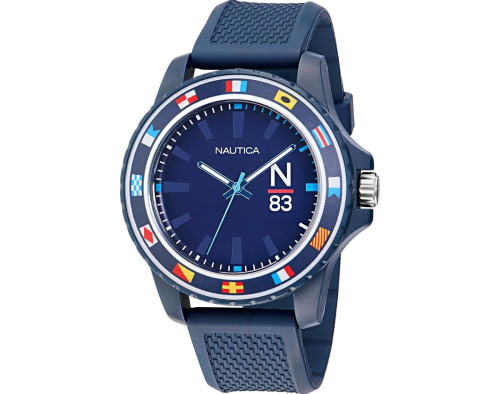 Kvarcas Vyras Rankinis laikrodis Nautica NAPFWF307 su Derva dėklu, 45 mm skersmens, Mineralinis stiklas, Mėlyna ciferblatu ir Mėlyna Silikonas apyranke.
