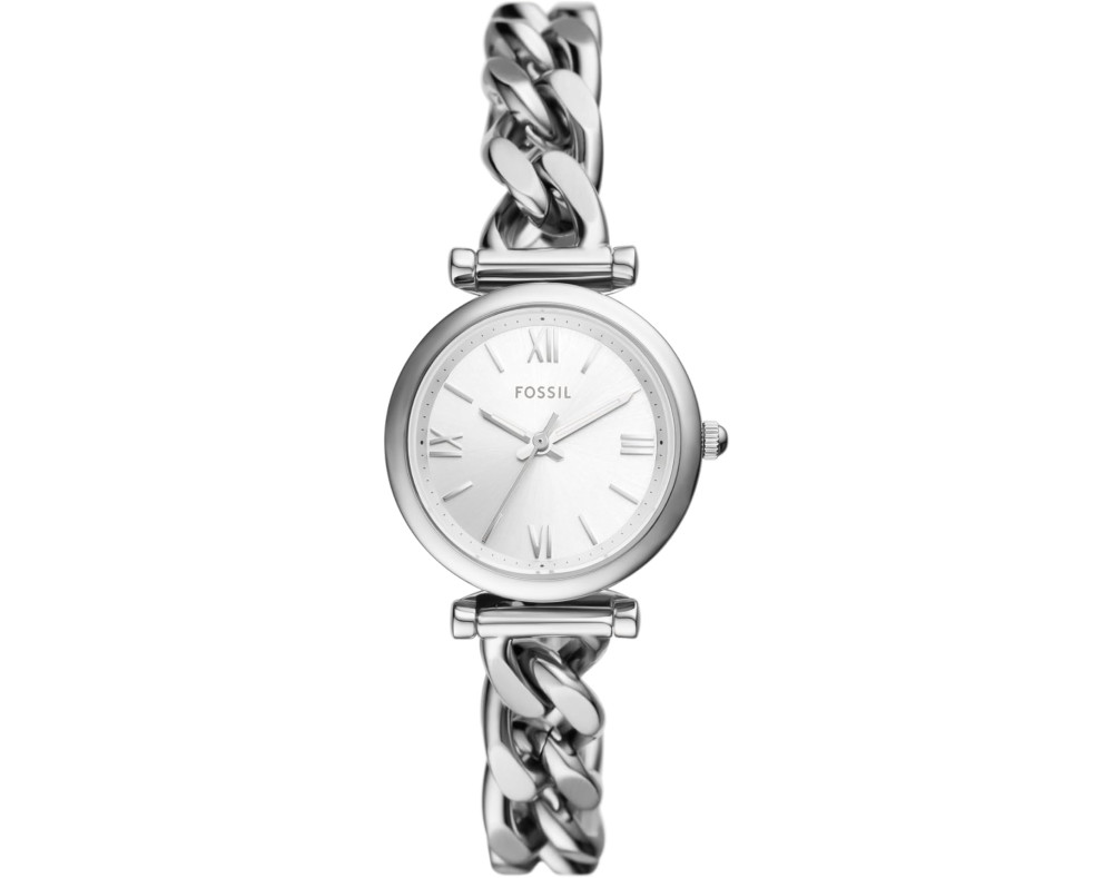 Kvarcs Sieviete Rokas pulkstenis Fossil ES5331 ar Nerūsējošais tērauds korpusu, ar diametru 28 mm, Minerāls stikls, Sudrabs ciparnīcu un Sudrabs Nerūsējošais tērauds siksnu.