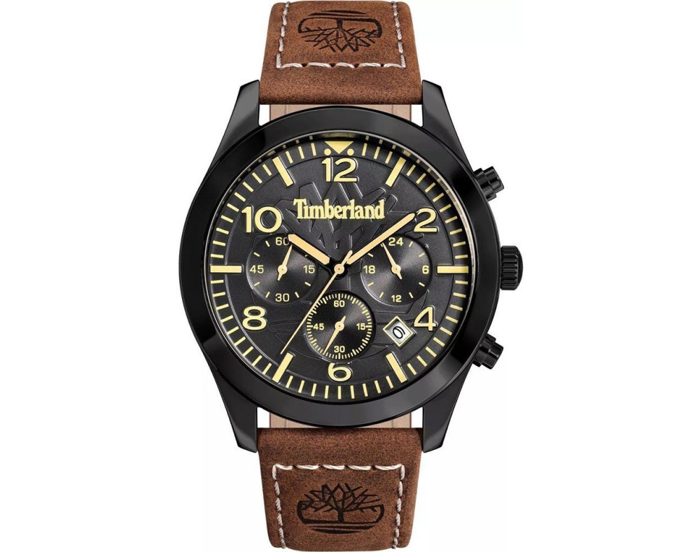 Kvarcs Cilvēks Rokas pulkstenis Timberland TDWGC0068802 ar Nerūsējošais tērauds korpusu, ar diametru 43 mm, Minerāls stikls, Melns ciparnīcu un Brūns Āda siksnu.