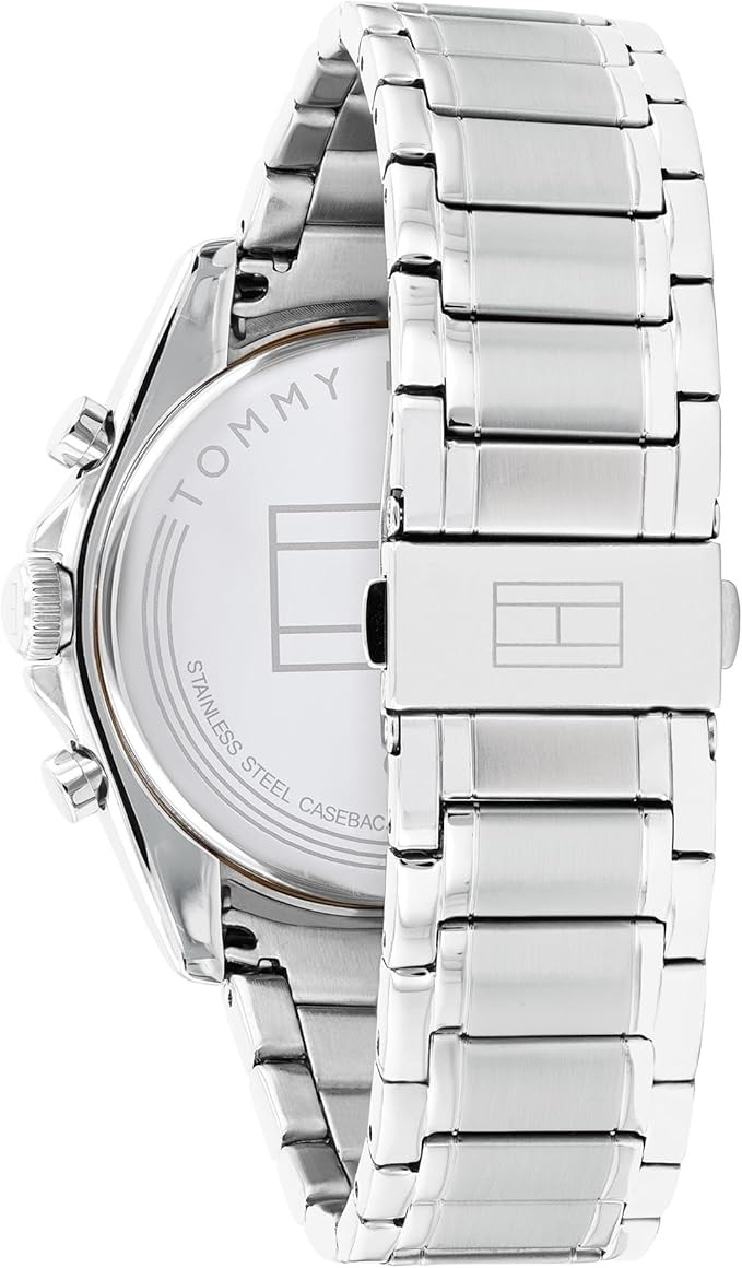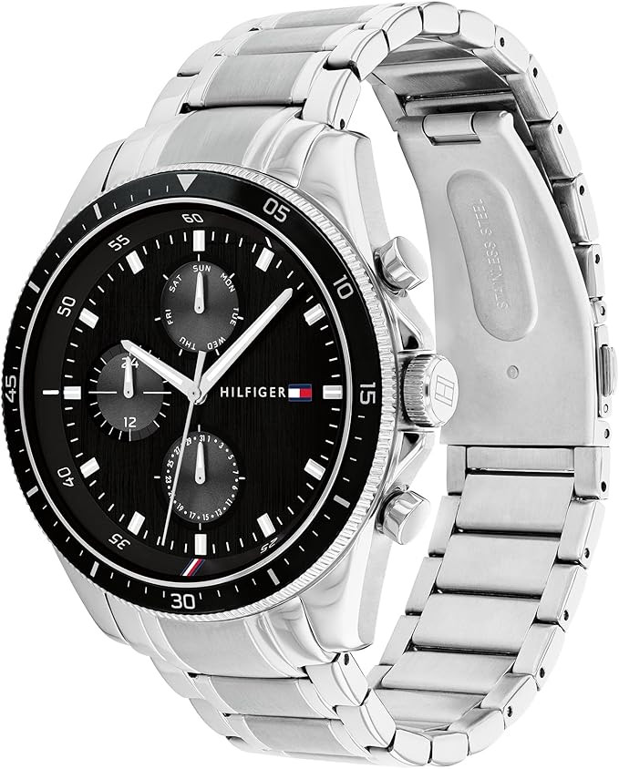 Kvarcs Cilvēks Rokas pulkstenis Tommy Hilfiger 1791835 ar Nerūsējošais tērauds korpusu, ar diametru 44 mm, Minerāls stikls, Melns ciparnīcu un Sudrabs Nerūsējošais tērauds siksnu.