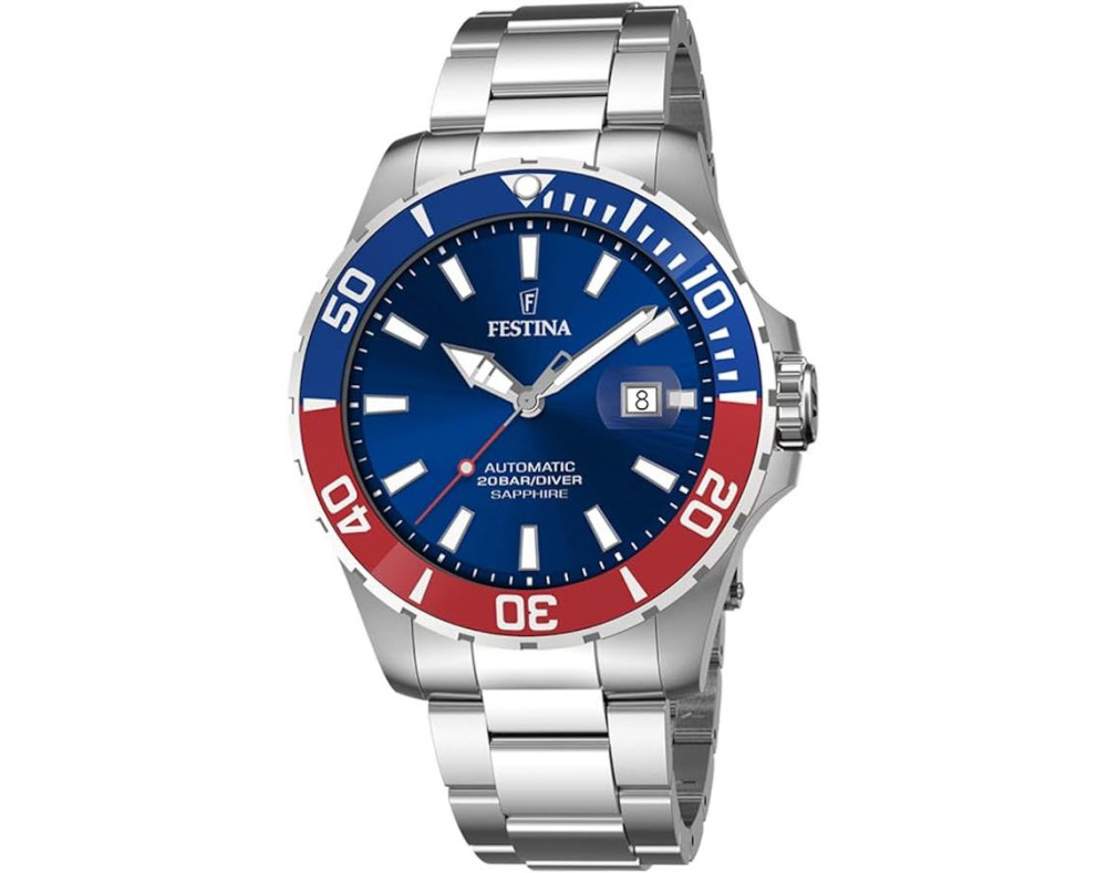 Mehānisks Cilvēks Rokas pulkstenis Festina F20531/5 ar Nerūsējošais tērauds korpusu, ar diametru 44 mm, Minerāls ar safīru apstrādi stikls, Zils ciparnīcu un Sudrabs Nerūsējošais tērauds siksnu.