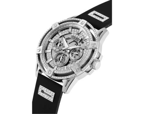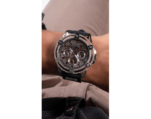 Kvarcs Cilvēks Rokas pulkstenis Guess GW0537G1 ar Nerūsējošais tērauds korpusu, ar diametru 48 mm, Minerāls stikls, Sudrabs ciparnīcu un Melns Silikona siksnu.