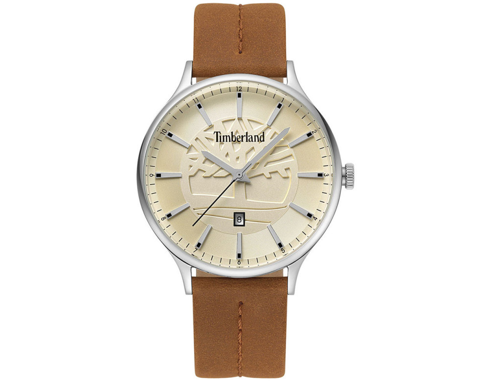 Кварц Мужчина Наручные часы Timberland TBL15488JS07, корпус Нержавеющая сталь, диаметр 43 mm, Минеральная стекло, Бежевый циферблат и Коричневый Кожа ремешок.