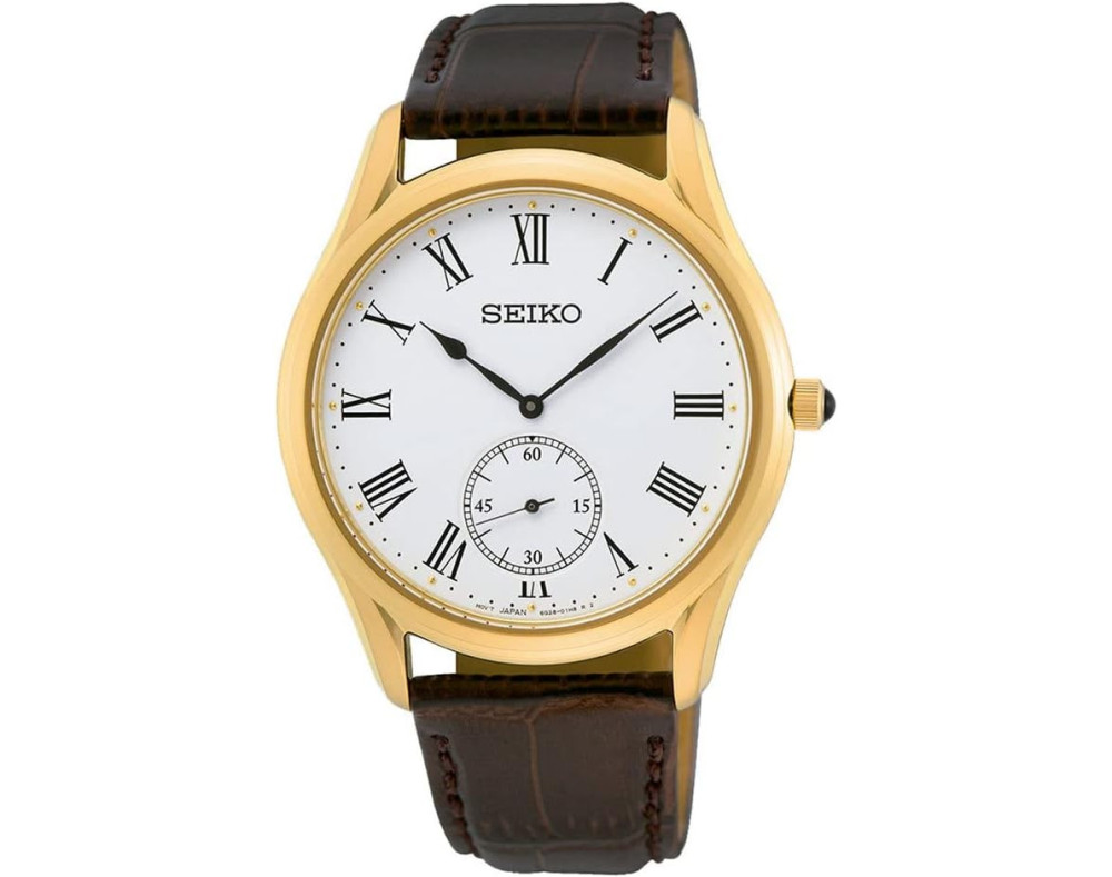 Кварц Мужчина Наручные часы Seiko SRK050P1, корпус Нержавеющая сталь, диаметр 39 mm, Минерал с обработкой сапфиром стекло, Белый циферблат и Коричневый Кожа ремешок.