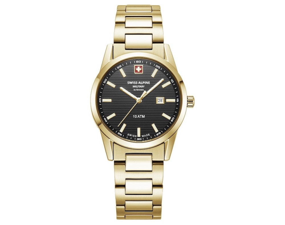 Кварц Женщина Наручные часы Swiss Alpine Military SAM7767.1117, корпус Нержавеющая сталь, диаметр 34 mm, Минеральная стекло, Черный циферблат и Золото Нержавеющая сталь ремешок.