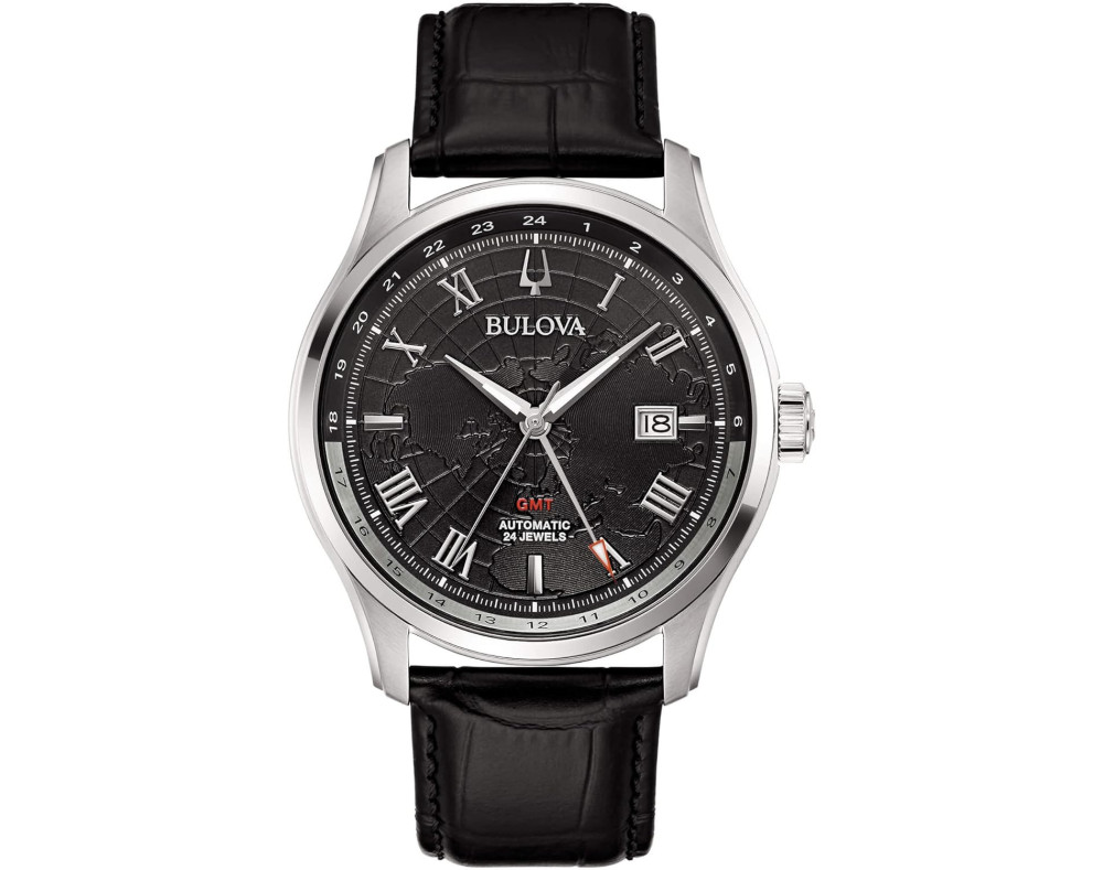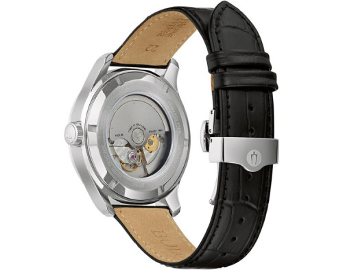 механический Мужчина Наручные часы Bulova 96B387, корпус Нержавеющая сталь, диаметр 43 mm, Минерал с обработкой сапфиром стекло, Черный циферблат и Черный Кожа ремешок.