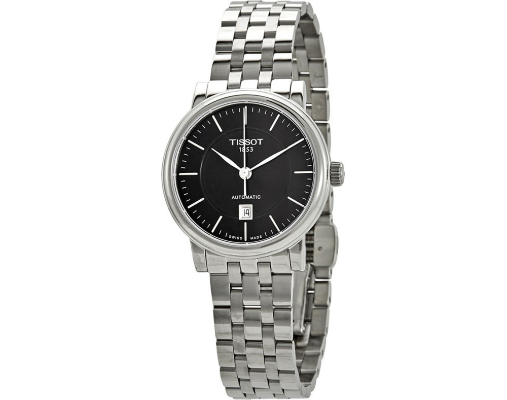 механический Женщина Наручные часы Tissot T122.207.11.051.00, корпус Нержавеющая сталь, диаметр 30 mm, Минерал с обработкой сапфиром стекло, Черный циферблат и Серебро Нержавеющая сталь ремешок.
