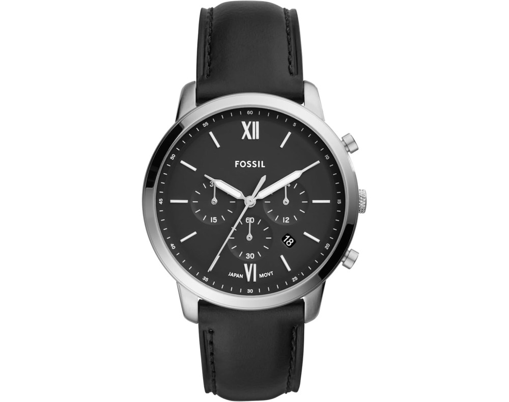 Armbanduhr Fossil Neutra FS5452 für Herren mit Quarzwerk, Uhrengehäuse aus Edelstahl mit einem Durchmesser von 44 mm, Ziffernblatt Schwarz und Uhrenarmband aus Leder in der Farbe Schwarz.