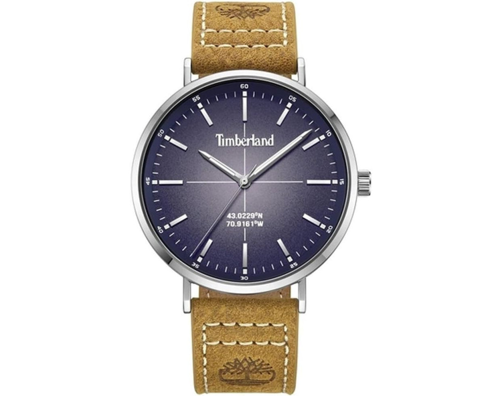Armbanduhr Timberland Rangeley TDWGA2231102 für Herren mit Quarzwerk, Uhrengehäuse aus Edelstahl mit einem Durchmesser von 42 mm, Ziffernblatt Blau und Uhrenarmband aus Leder in der Farbe Braun.