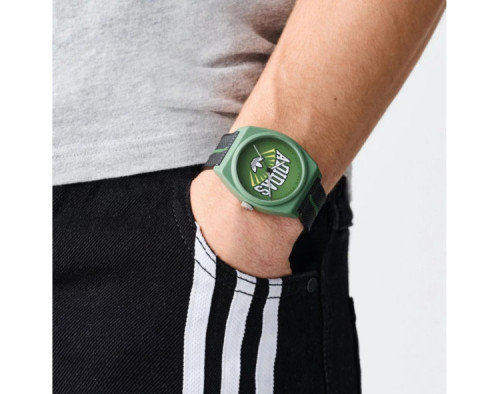 Armbanduhr Adidas Project Two AOST25036 für Unisex mit Quarzwerk, Uhrengehäuse aus Plastik mit einem Durchmesser von 38 mm, Ziffernblatt Grün und Uhrenarmband aus Resin in der Farbe Schwarz.