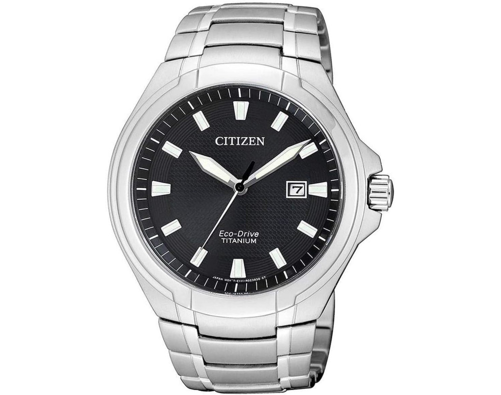 Armbanduhr Citizen Eco-Drive Super-Titanium BM7430-89E für Herren mit Quarzwerk, Uhrengehäuse aus Titan mit einem Durchmesser von 43 mm, Ziffernblatt Schwarz und Uhrenarmband aus Titan in der Farbe Silber.