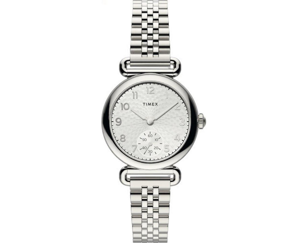 Armbanduhr Timex TW2T88800 für Damen mit Quarzwerk, Uhrengehäuse aus Edelstahl mit einem Durchmesser von 34 mm, Ziffernblatt Silber und Uhrenarmband aus Edelstahl in der Farbe Silber.