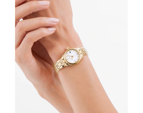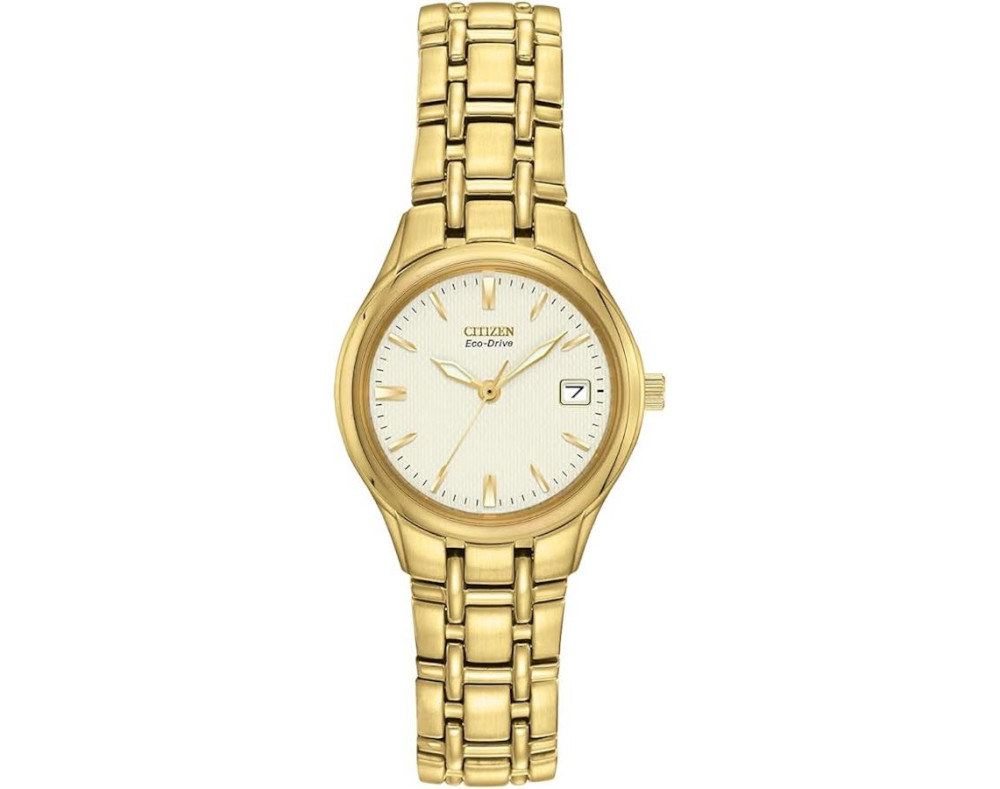 Armbanduhr Citizen Eco Drive EW1262-55P für Damen mit Quarzwerk, Uhrengehäuse aus Edelstahl mit einem Durchmesser von 25 mm, Ziffernblatt Gold und Uhrenarmband aus Edelstahl in der Farbe Gold.