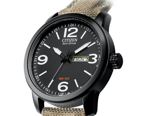 Montre bracelet Citizen Eco-Drive BM8476-23E pour Homme à Quartz, avec une boîtier de Acier inoxydable d’un diamètre de 42 mm, avec un cadran Noir et avec un bracelet de Tissu en couleur Beige.