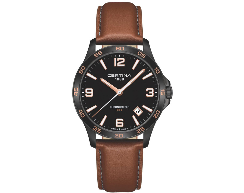 Montre bracelet Certina DS-8 C033.851.36.057.00 pour Homme à Quartz, avec une boîtier de Acier inoxydable d’un diamètre de 42 mm, avec un cadran Noir et avec un bracelet de Cuir en couleur Marron.