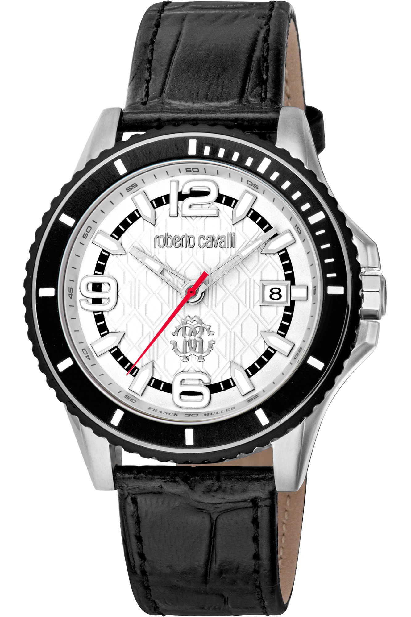 Quartz Man Wristwatch Roberto Cavalli by Franck Muller RV1G217L0011 with Stainless steel case, with diameter 42 mm, Silver dial and Black Leather band.