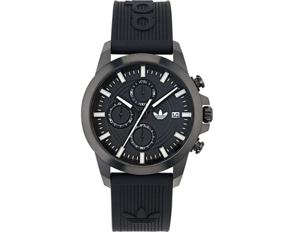 Quartz Unisex Wristwatch Adidas Expression Two AOFH24521 with Stainless steel case, with diameter 43 mm, Black dial and Black Silicon band.