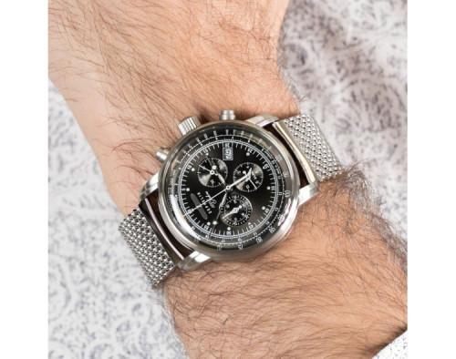 Orologio da polso Zeppelin 100 Years 7680M-2 Cronografo Uomo con movimento Al quarzo, cassa in Acciaio inossidabile di diametro 42 mm, quadrante Nero, vetro Minerale K1 e cinturino in Maglia milanese di colore Argento.