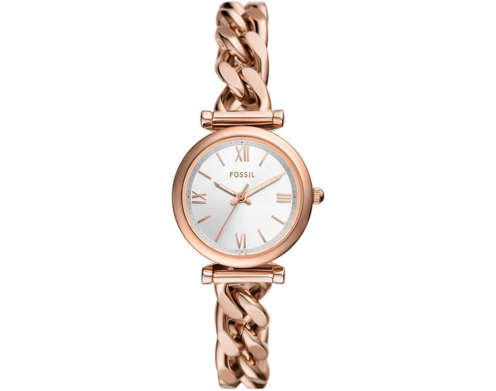 Kvarcas Moteris Rankinis laikrodis Fossil ES5330 su Nerūdijantis plienas dėklu, 28 mm skersmens, Mineralinis stiklas, Sidabras ciferblatu ir Rožinis auksas Nerūdijantis plienas apyranke.